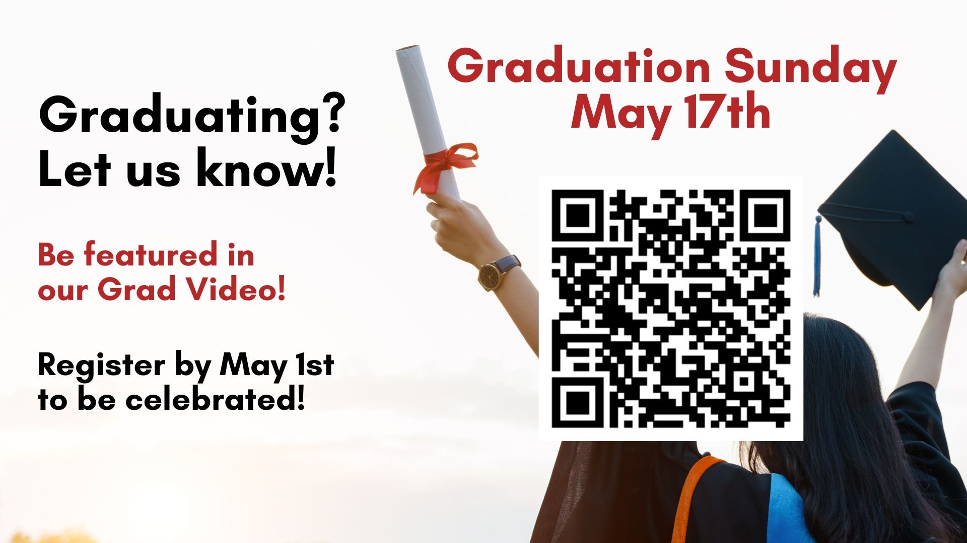 Graduates: Please be sure to register by May 1 so we can properly recognize and celebrate you during the service.